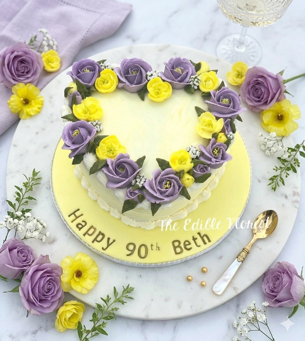 A truly eye-catching centrepiece, this floral wreath cake is designed to impress from every angle. Adorned with an exquisite ring of hand-piped edible flowers, each bloom is carefully crafted to create a beautifully natural, garden-inspired finish.