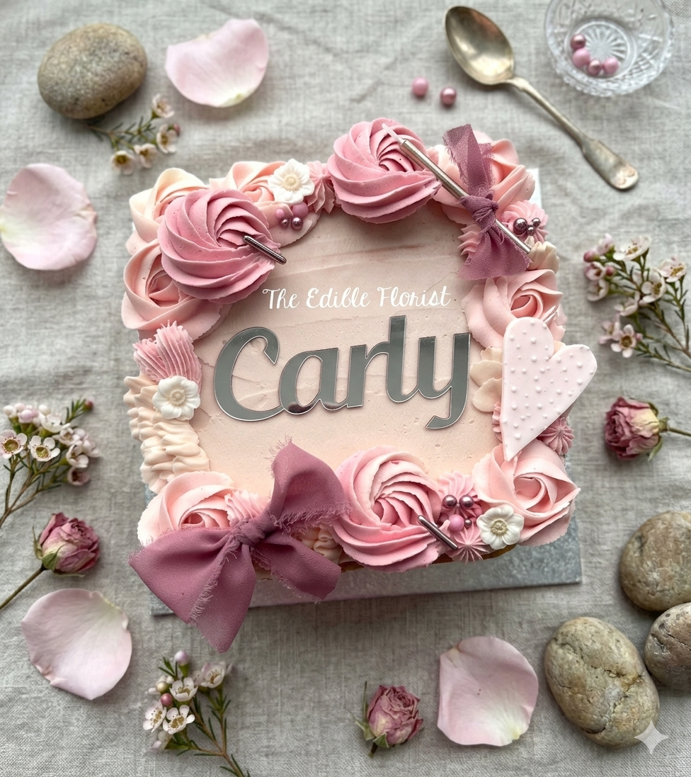 The much-loved Country Garden Cake, reimagined as a standalone design. Unlike the original traybake style, this version is presented on a cake board with smooth buttercream edges and delicate piped detailing around the base.