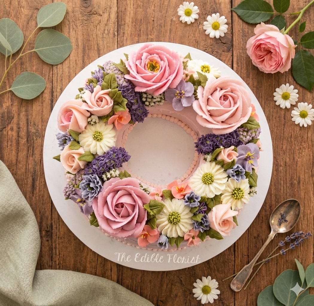 A truly eye-catching centrepiece, this floral wreath cake is designed to impress from every angle. Adorned with an exquisite ring of hand-piped edible flowers, each bloom is carefully crafted to create a beautifully natural, garden-inspired finish.